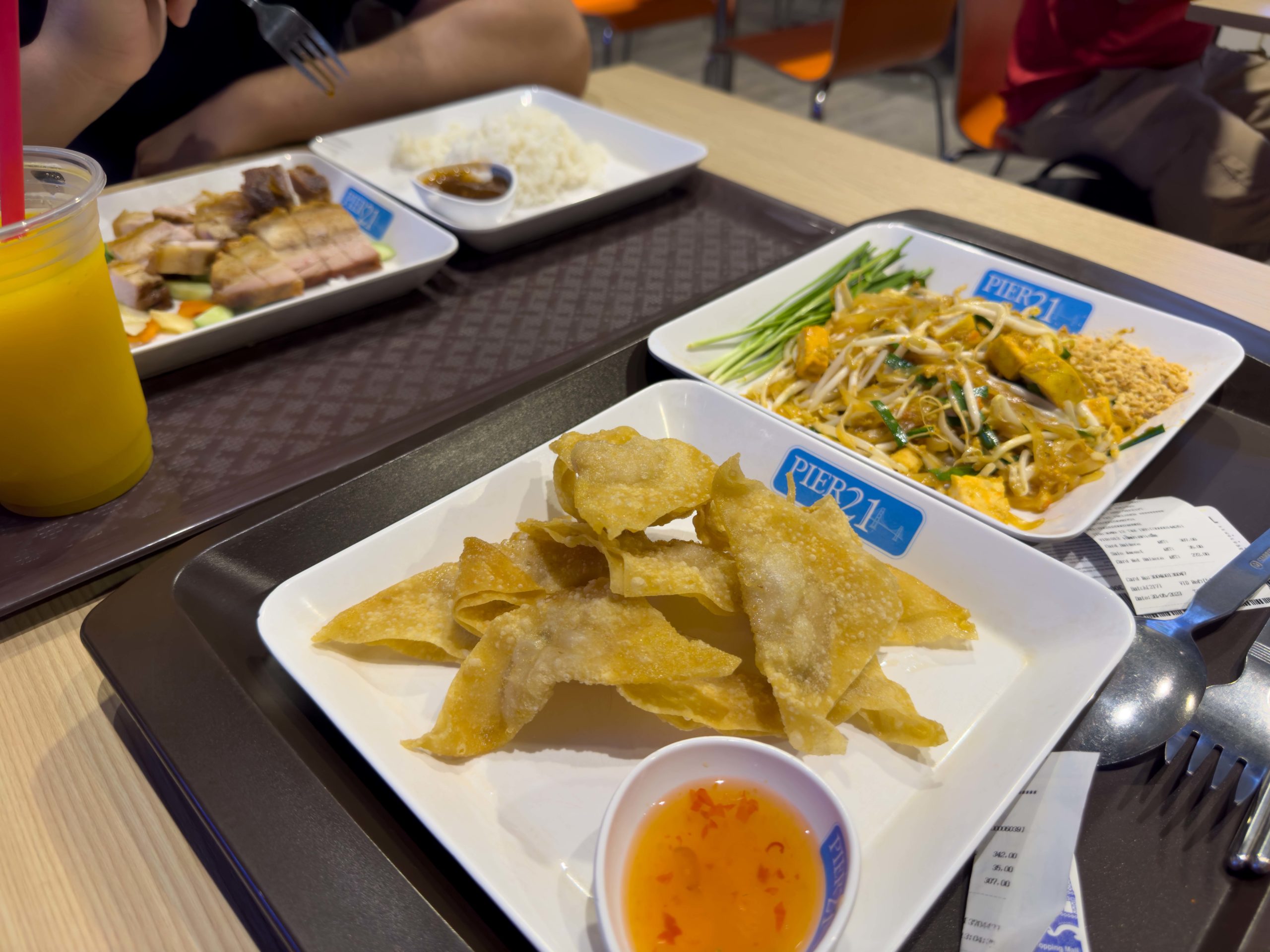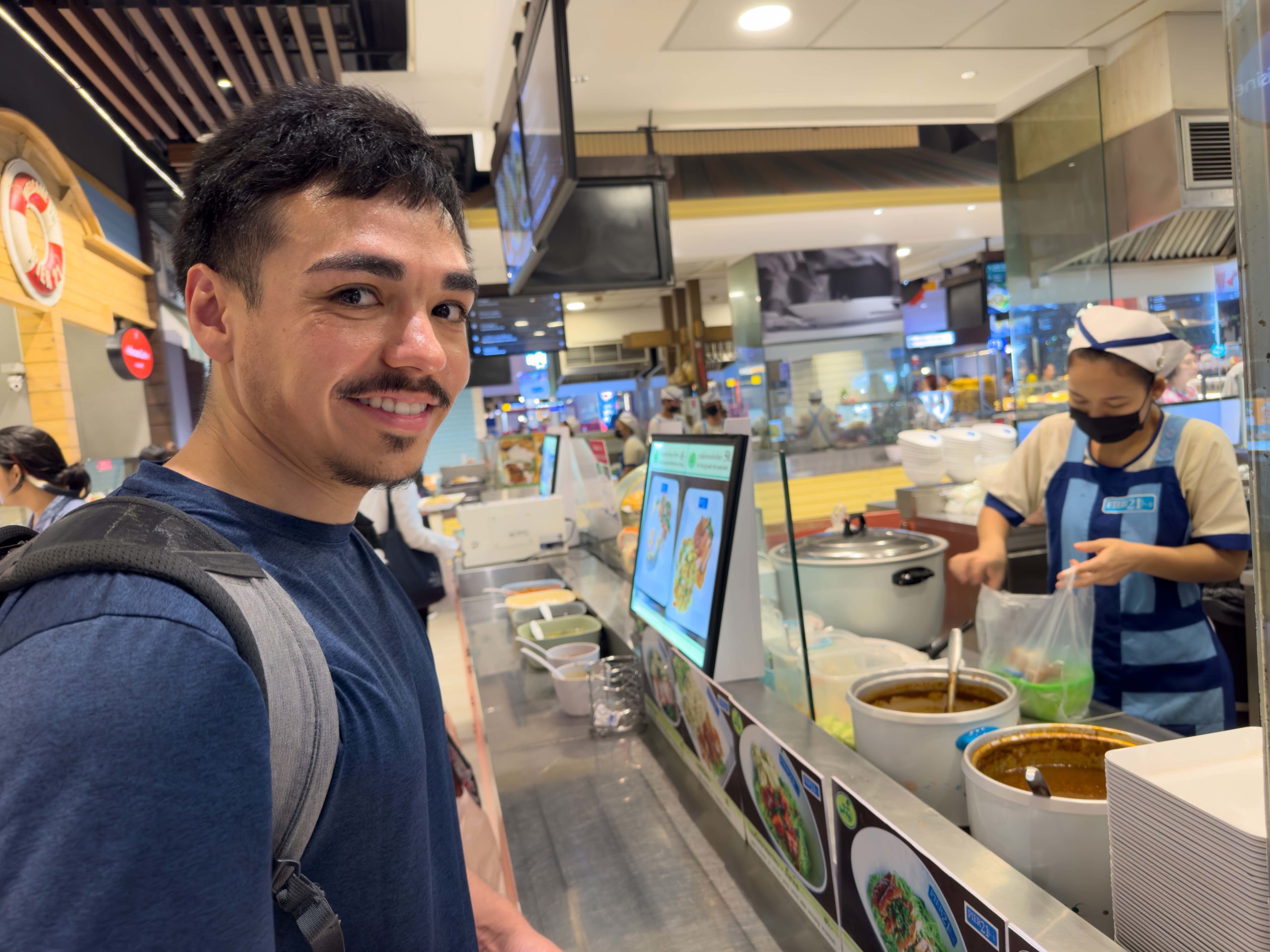 One of the best parts of visiting Thailand is that the cost of housing and dining can be relatively cheap. Although there are luxurious hotels and fine dining experiences where the sky’s the limit in terms of price, we kept ourselves to a modest budget. One of our favorite stops was the Pier 21 food court on the top floor of the Terminal 21 shopping mall. Pier 21 has a market-style atmosphere, where numerous food stalls offer a variety of foods at reasonable prices. Upon entering the food court, you purchase yourself a prepaid dining card that is used to purchase food from the various vendors. Lunch and dinner for us often consisted of pad kra pow (ground pork and Thai basil stir fry) or roast pork and rice along with a fresh fruit smoothie, costing only about $2.00 per meal.